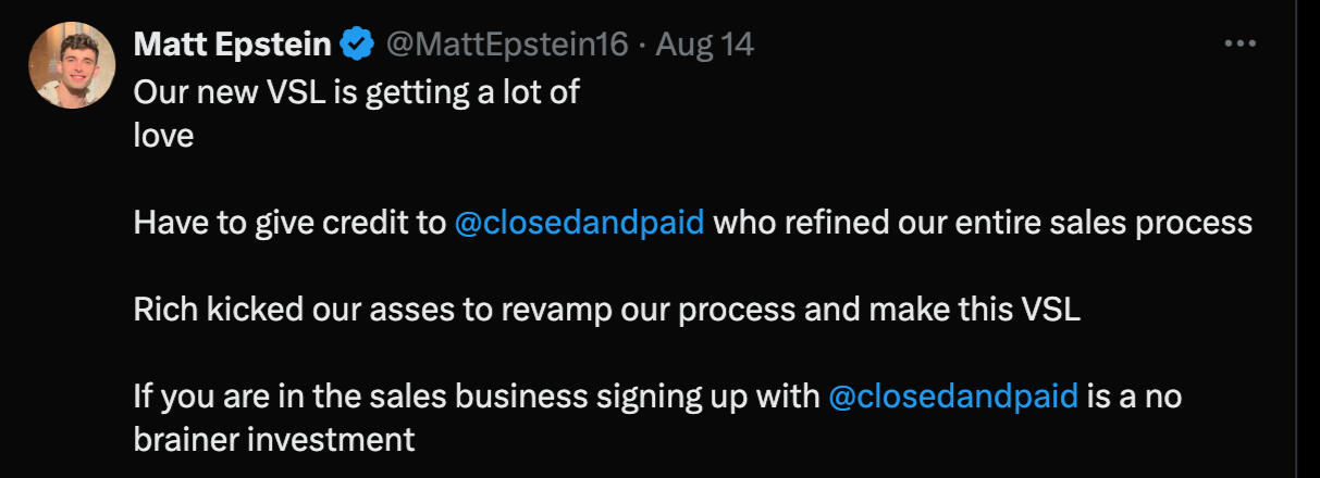For a long time I deliberated on whether i should release this info to the public, I resisted sharing exactly how I achieved these results in detail.The way I see it, there's more value in keeping secrets than sharing them. And, I simply wasn't motivated to teach it to everyone in detail.But I recently decided to offer it in a course format (super easy to consume):The Closed & Paid Sales ProcessNo, it won't make you a "sales guru."(Even though I've gotten testimonials from top sales professionals.)Or even a so-called "world-class" sales expert.And, while I call it “no-nonsense,” that doesn’t mean you can be lazy. It still takes hard work and time. It just doesn’t take nearly as much effort and time as other methods I’ve seen.Even so, I believe it can help you double or triple your sales… cut your selling time by as much as half (or more)… and virtually eliminate all the nagging frustration, stress, and confusion you feel when trying to close deals now.However, a word of warning: